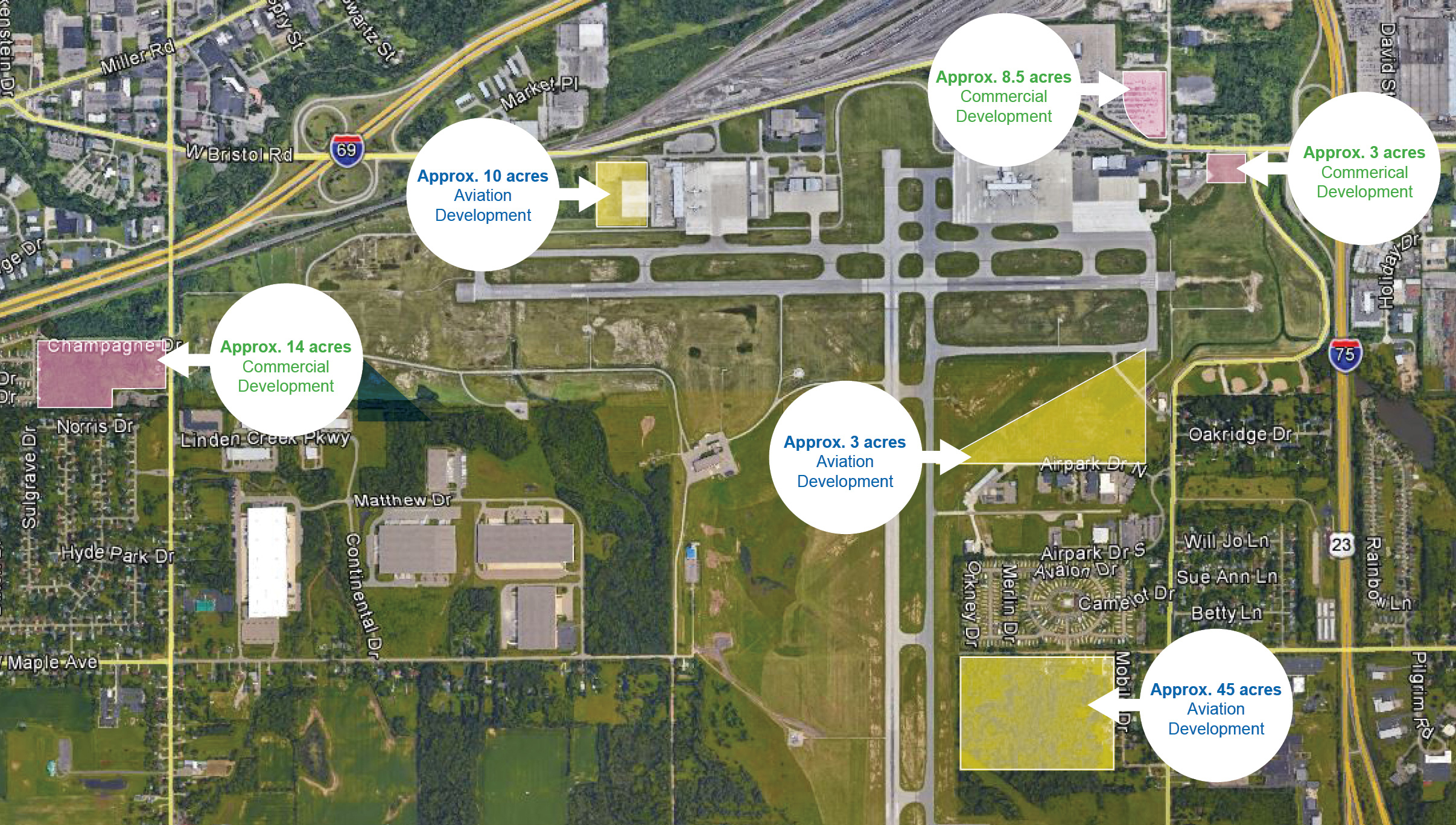 10 acres (approx), zoned Airport District (AD) within Flint Township. 5.5 acres (approx), zoned Industrial (E) within City of Flint. 3 acres (approx), zoned Industrial (E) within City of Flint. 46 acres (approx), zoned Industrial (E) within City of Flint, parcel may be split. 1.5 acres (approx), zoned Industrial (E) within City of Flint. 2.5 acres (approx), zoned Industrial (E) within City of Flint. 27 acres (approx), partially zoned Residential Suburban Agricultural (RSA) within Mundy Township and Industrial (E) within City of Flint, parcel may be split. 24.5 acres (approx), zoned Industrial (E) within City of Flint, parcel may be split. 71 acres (approx), zoned Residential Suburban Agricultural (RSA) within Mundy Township, parcel may be split. 77 acres (approx), primarily zoned Industrial (E) within City of Flint, partially zoned Residential Suburban Agricultural (RSA) within Mundy Township, parcel may be split. 7 acres (approx), zoned Industrial (E) within City of Flint.  11 acres (approx), zoned Industrial (E) within City of Flint.  3 acres (approx) , zoned Airport District (AD) within Flint Township.